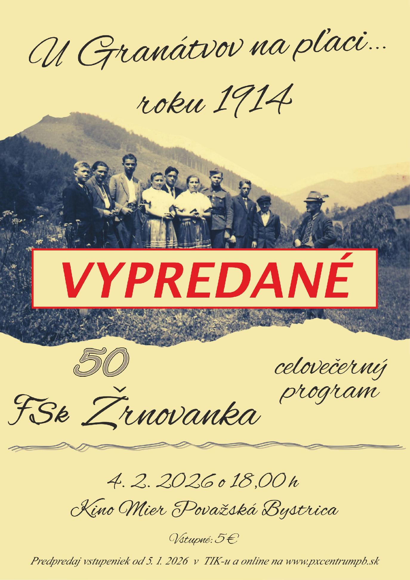 Predpredaj vstupeniek od 5. 1. 2026 v Turistickej informačnej kancelárii v pracovných dňoch pondelok - piatok 8:00 - 16:00 h, streda 8:00 - 18:00 h. Tel. číslo: 042/4326 545, 0917 450 666, rezervácie a online predaj na stránke www.pxcentrumpb.sk